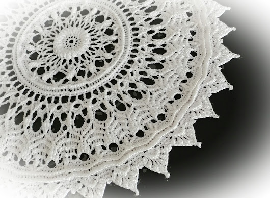 This was a foreign chart that I found on the web and really liked. I don't actually know the name of it, so I named it "Delightful" doily. It was made with Red Heart #20 thread in white using an 8/1.50mm hook. It measures 22 inches.